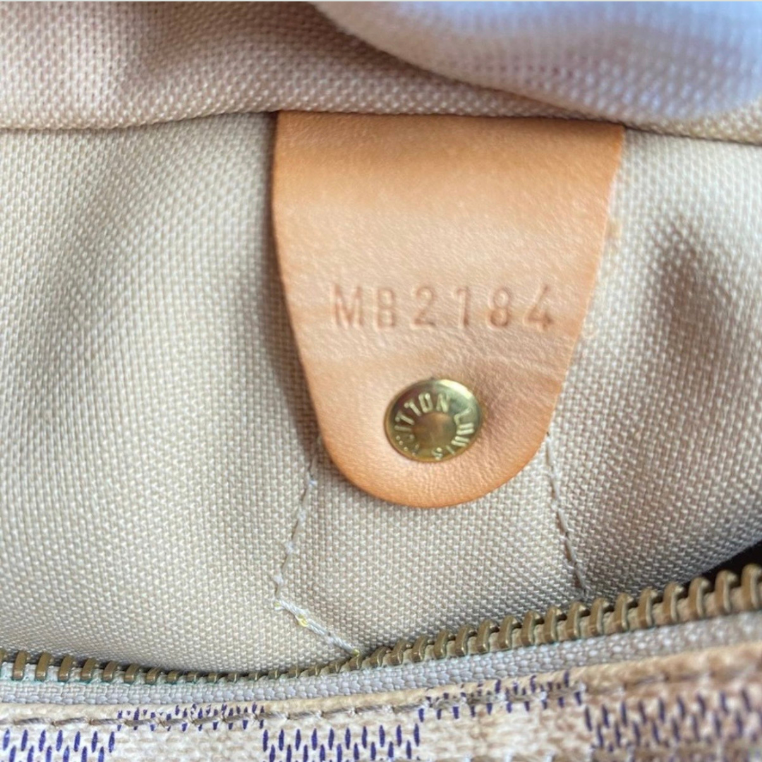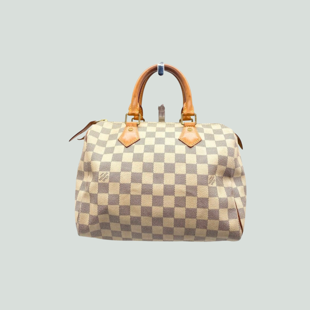 This pre-owned Louis Vuitton Speedy 25 is in good vintage condition. The Damier Azur canvas is clean and holds its shape well. The vachetta leather trim and handles show a medium patina with visible wear, including dryness, marks, and small scuffs consistent with use. Hardware remains functional with light tarnish, and the zipper runs smoothly. The interior is generally clean with some visible marks — please see photos for details.
